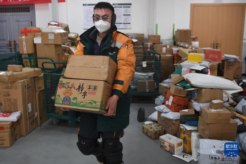 12月23日,在蘭州市城關區中國郵政速遞物流一個攬投部,快遞員在搬運快件。