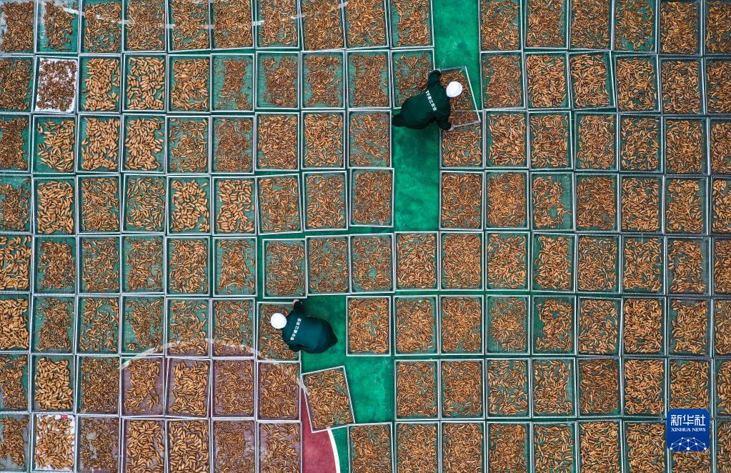 12月22日,工人在貴州省黎平青江農業開發有限公司晾曬天麻(無人機照片)。
