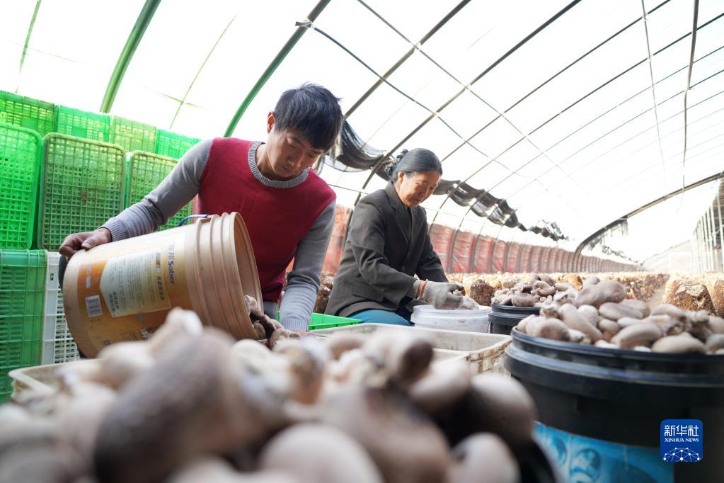 12月23日,內丘縣下馬莊村村民在大棚里分揀香菇。