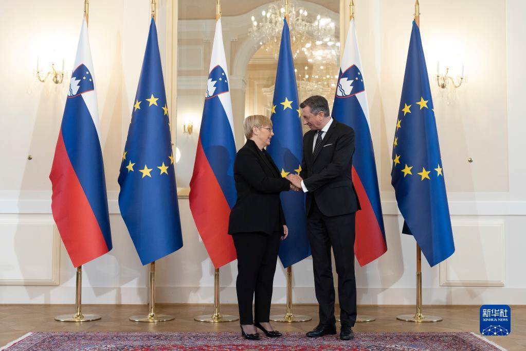 12月23日,在斯洛文尼亞盧布爾雅那,娜塔莎·皮爾茨·穆薩爾(左)與博魯特·帕霍爾在總統權力交接儀式上握手。