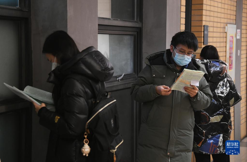 12月24日,在北京外國語大學考點,考生在進入考場前復習。