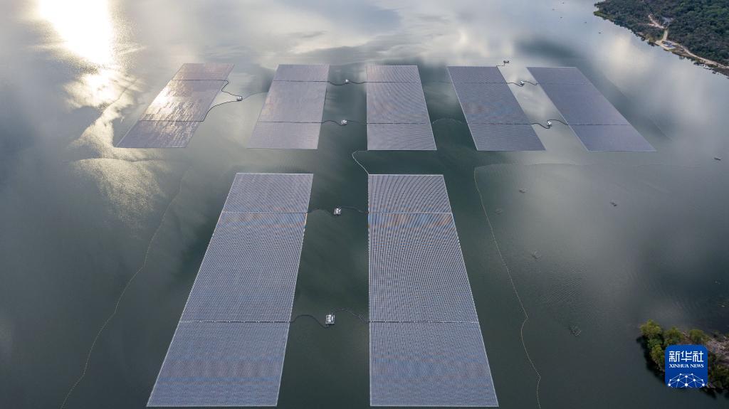 這是12月8日在泰國烏汶府詩琳通水庫拍攝的浮體光伏項目(無人機照片)。