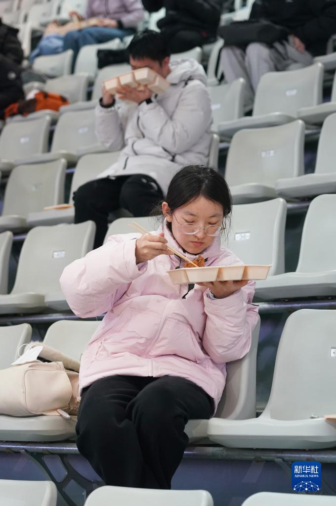 12月24日,在西安電子科技大學考點,考生在體育館內分散就餐。