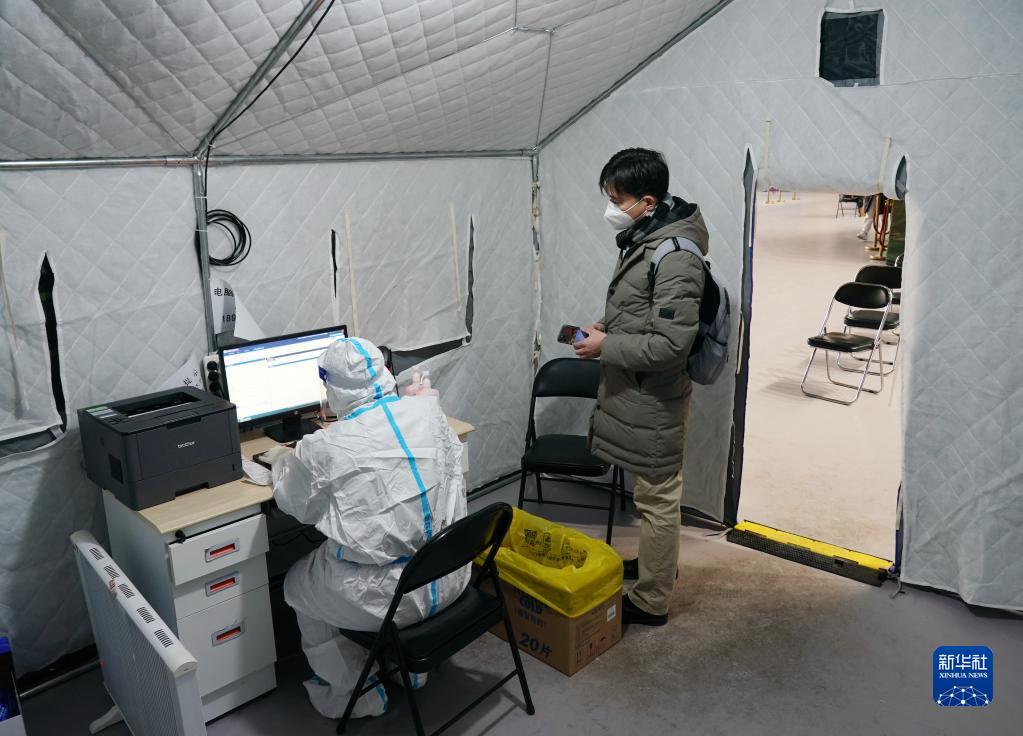 12月24日,醫生在北京市西城區廣安體育館簡易發熱門診為前來就診的市民開藥。