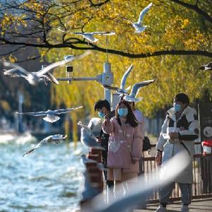 12月23日,一名游客在昆明滇池海埂公園里喂紅嘴鷗。