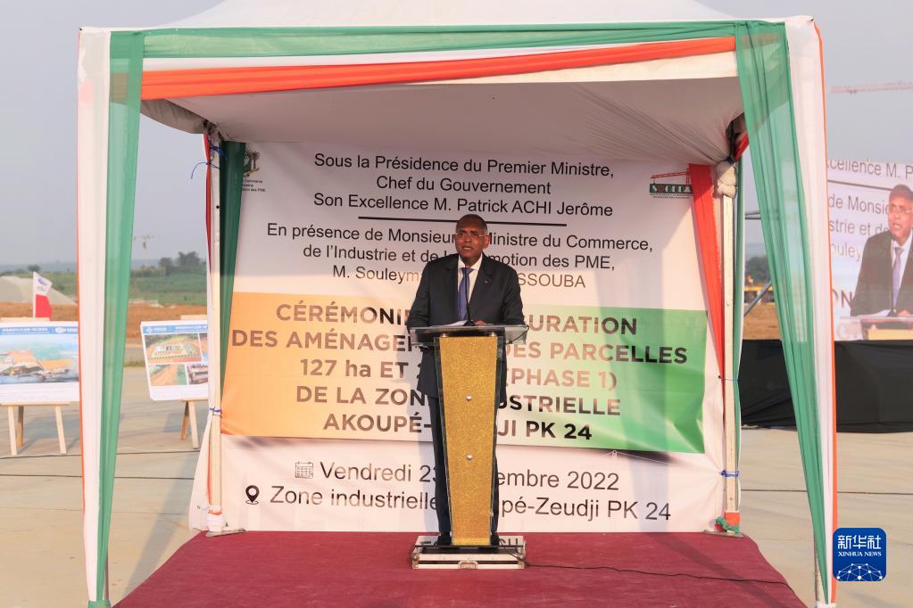 12月23日,在科特迪瓦阿比讓市西北部,科特迪瓦總理帕特里克·阿希在PK24工業園一期項目竣工儀式上致辭。