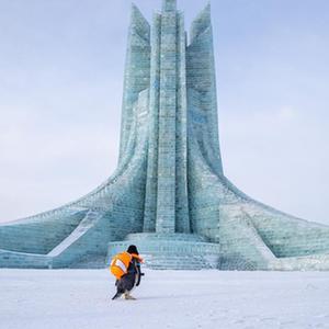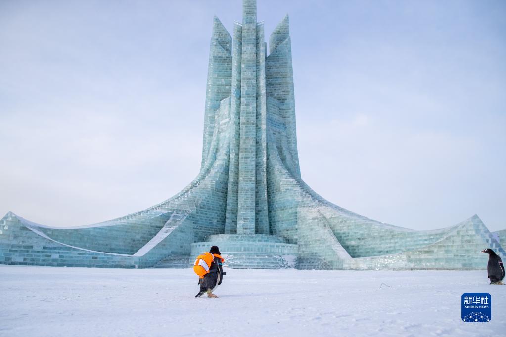 當日,哈爾濱極地公園的四只企鵝來到哈爾濱冰雪大世界園區“參觀”。