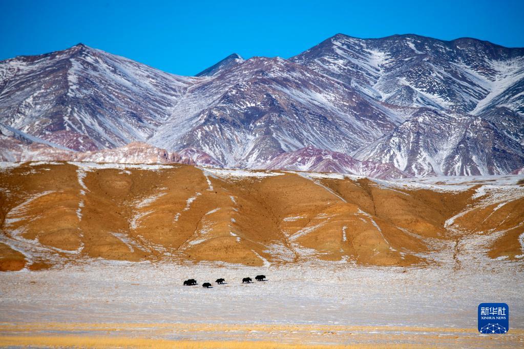 一場降雪過后,地處甘肅省酒泉市阿克塞哈薩克族自治縣境內的哈爾騰高原被皚皚白雪覆蓋,成群的藏野驢、野牦牛等野生動物在高山雪地間戲雪覓食,為冬日的哈爾騰增添了不少生機與活力。