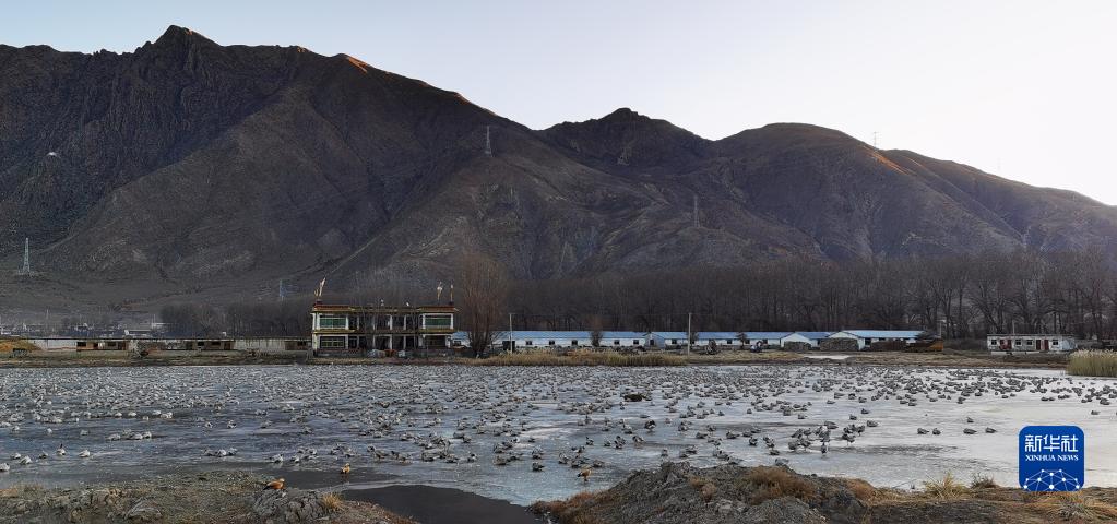 冬日清晨,拉薩市林周縣邊交林鄉的池塘里,大量斑頭雁、赤麻鴨等候鳥棲息(12月24日攝,手機照片)。