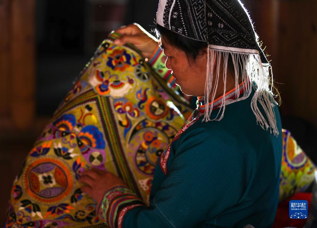 2022年5月2日,村民在貴州省榕江縣塔石鄉烏吉苗寨檢查苗族繡品。烏吉苗寨是黔東南州苗族蠟染刺繡非物質文化遺產生產性保護示范基地。近年來,當地積極挖掘苗族刺繡、蠟染等“非遺”技藝,帶動村民從事苗族傳統刺繡、蠟染等手工制品生產與外銷,實現“非遺”傳承與市場對接,走出一條傳統“非遺”助力鄉村振興的新路子。