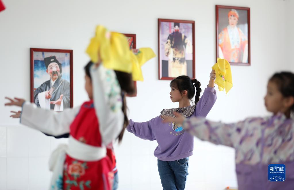 2022年5月25日,湖南省資興市鯉魚江完全小學的學生在練習戲曲基本動作。近年來,湖南省資興市積極推進傳統戲曲進校園,通過設立培訓基地、興趣班、“第二課堂”等形式,邀請專業戲曲老師走進校園,為學生進行京劇、花鼓戲等教學輔導,讓孩子們感受非遺文化的魅力。