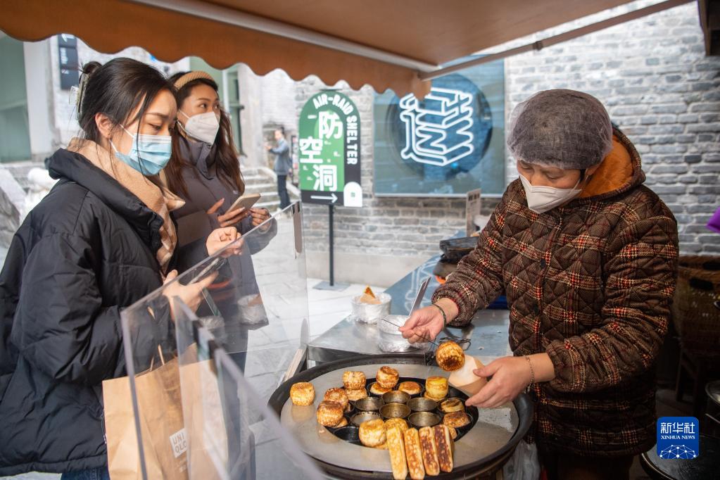 12月24日,在位于重慶解放碑商圈的著名景點山城巷,游客購買當地特色小吃。
