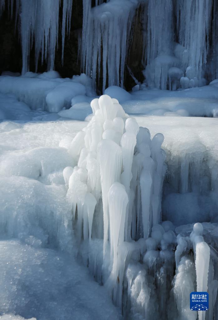 寒冬時節,山東省臨沂市沂南縣香山湖畔的崖壁上出現冰瀑景觀。形態各異的冰瀑、冰掛、冰柱晶瑩剔透,蔚為壯觀。