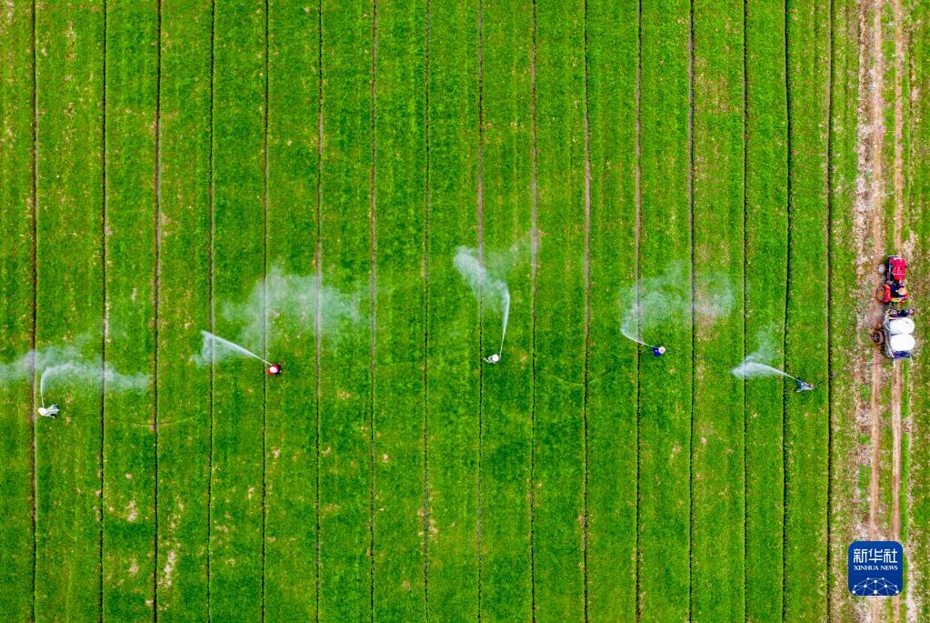 2月16日,安徽省廬江縣白湖鎮農民在進行小麥病蟲害防治作業(無人機照片)。