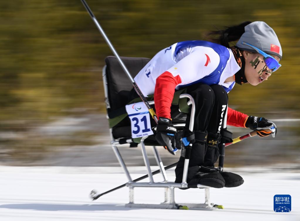 這是2022年3月6日,中國選手楊洪瓊在北京2022年冬殘奧會殘奧越野滑雪女子長距離(坐姿)比賽中。
