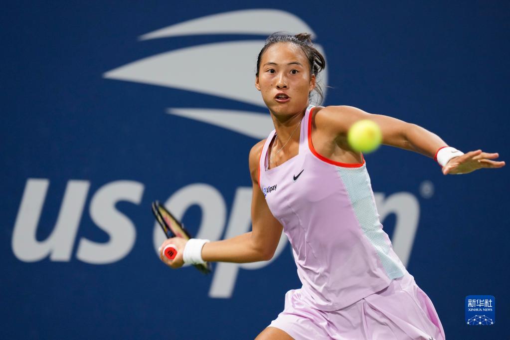 這是2022年9月3日,鄭欽文在2022美國網球公開賽女子單打第三輪對陣德國選手尼邁爾的比賽中回球。