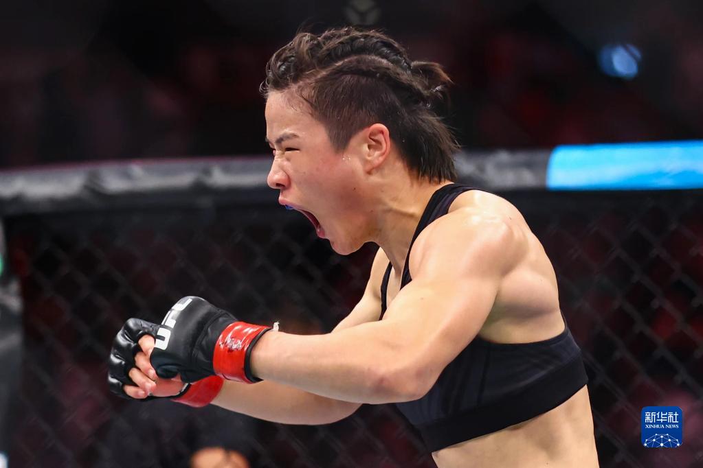 這是2022年6月12日,張偉麗在新加坡舉行的終極格斗冠軍賽UFC275對陣波蘭選手喬安娜·耶德爾澤西克的比賽后慶祝勝利。