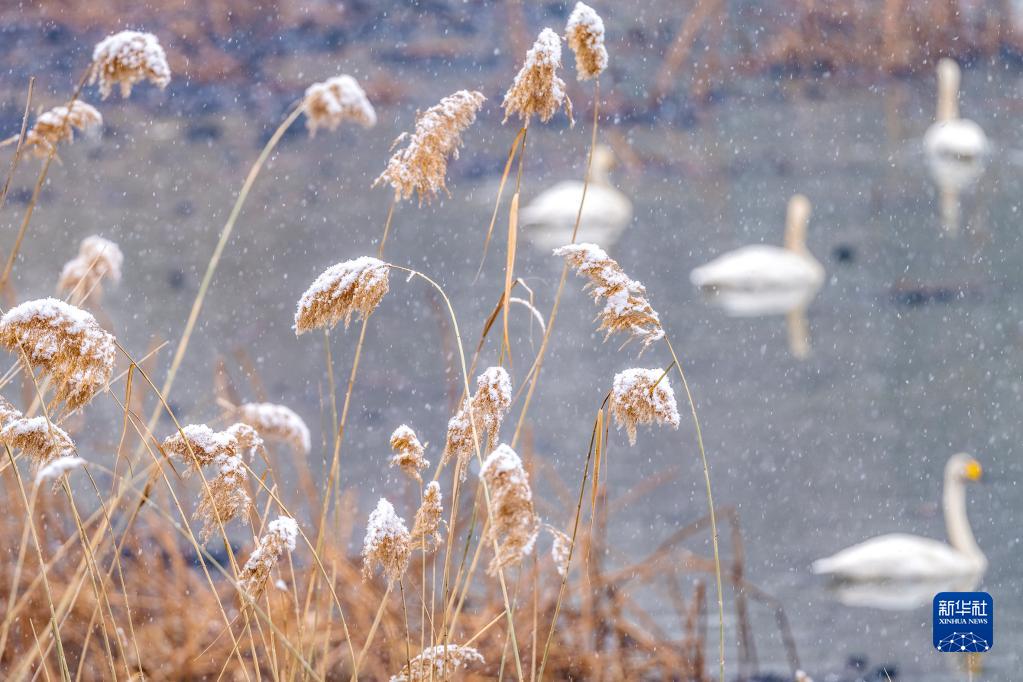 日前,河南三門峽天鵝湖國家城市濕地公園迎來小雪。白天鵝在雪中游弋,與冬景相映成趣。