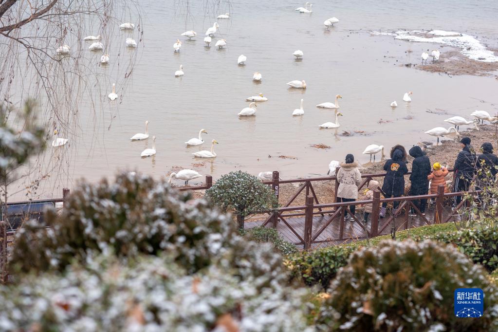 日前,河南三門峽天鵝湖國家城市濕地公園迎來小雪。白天鵝在雪中游弋,與冬景相映成趣。