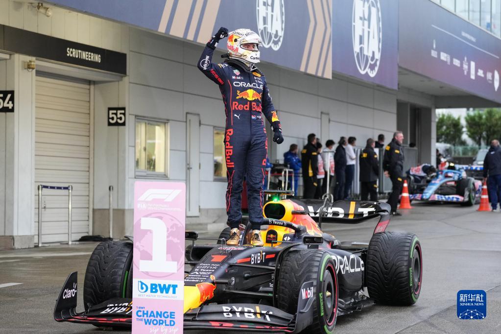 這是2022年10月9日,紅牛車隊荷蘭車手維斯塔潘慶祝獲得世界一級方程式賽車錦標賽(F1)日本大獎賽冠軍。