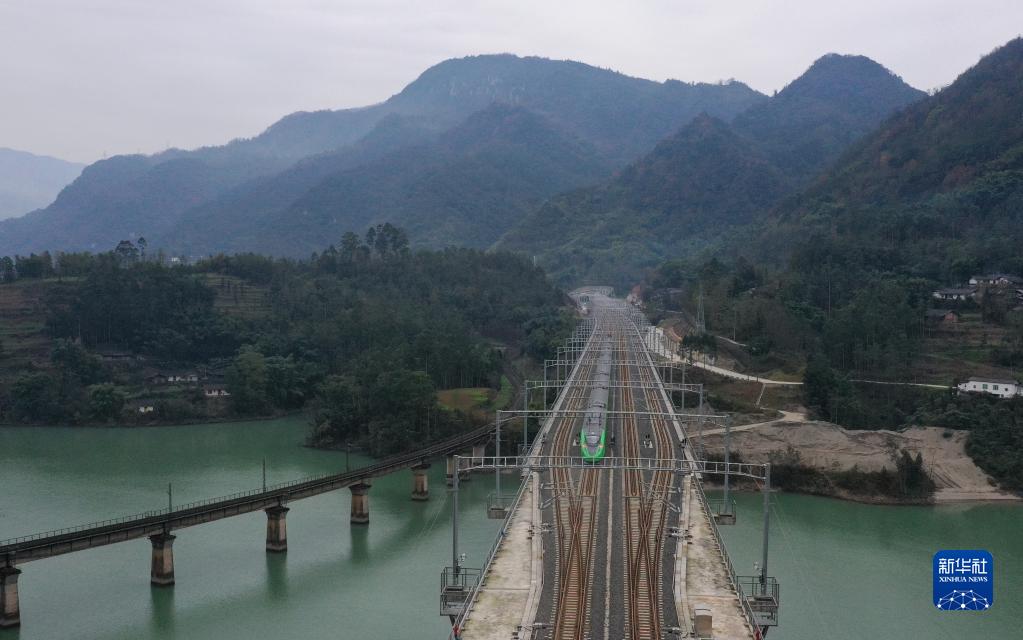 12月26日, 首發列車行駛在新成昆鐵路范店子特大橋上,旁邊是老成昆鐵路(無人機照片)。