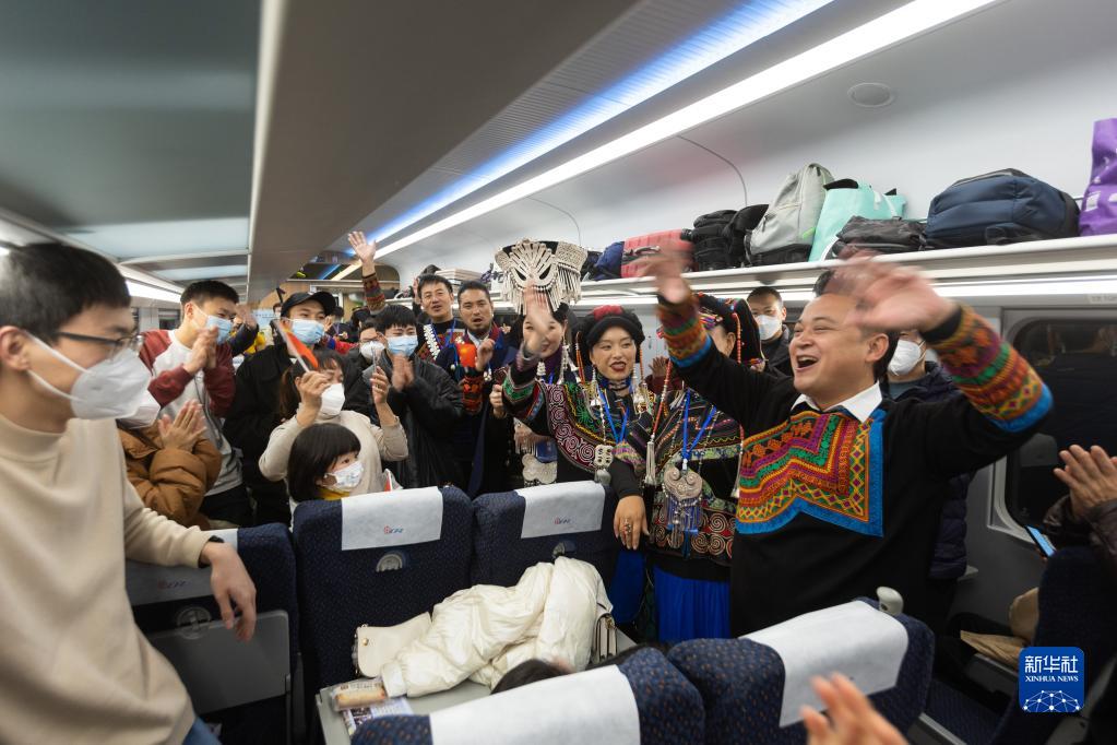 12月26日,彝族群眾身著節日的盛裝在新成昆鐵路首發列車上為乘客表演節目。