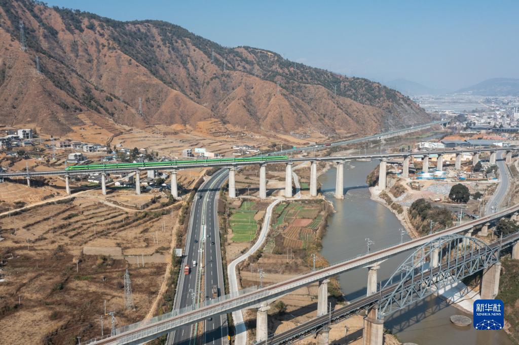 12月26日, C43次列車行駛在新成昆鐵路上,這段鐵路跨越安寧河和 G5京昆高速公路(無人機照片)。