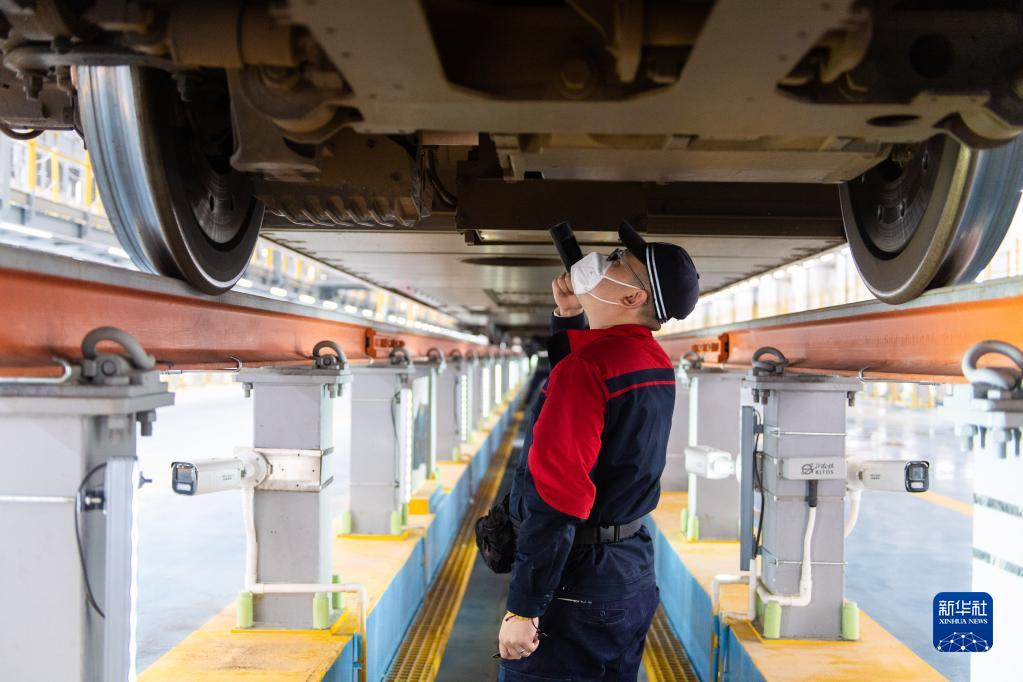12月26日,工作人員在渝廈高鐵長沙西動車運用所6線檢查庫對停放的列車進行檢修。
