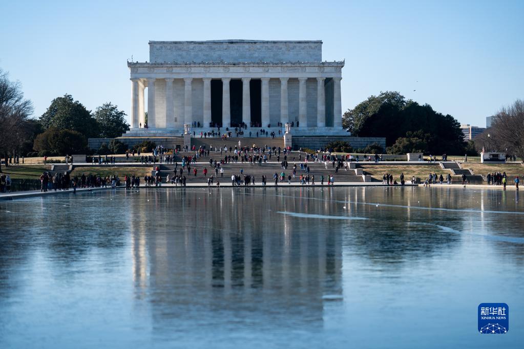 這是12月25日在美國首都華盛頓拍攝的結冰的林肯紀念堂倒影池。
