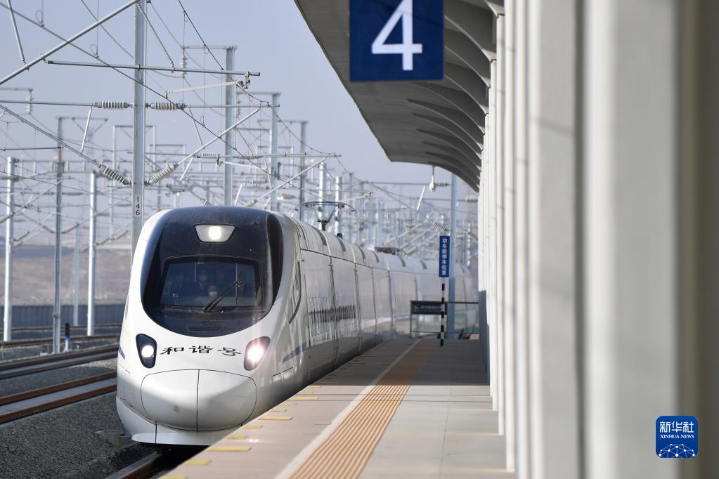 12月26日,一趟試運行動車組列車駛入銀蘭高鐵秦王川站。
