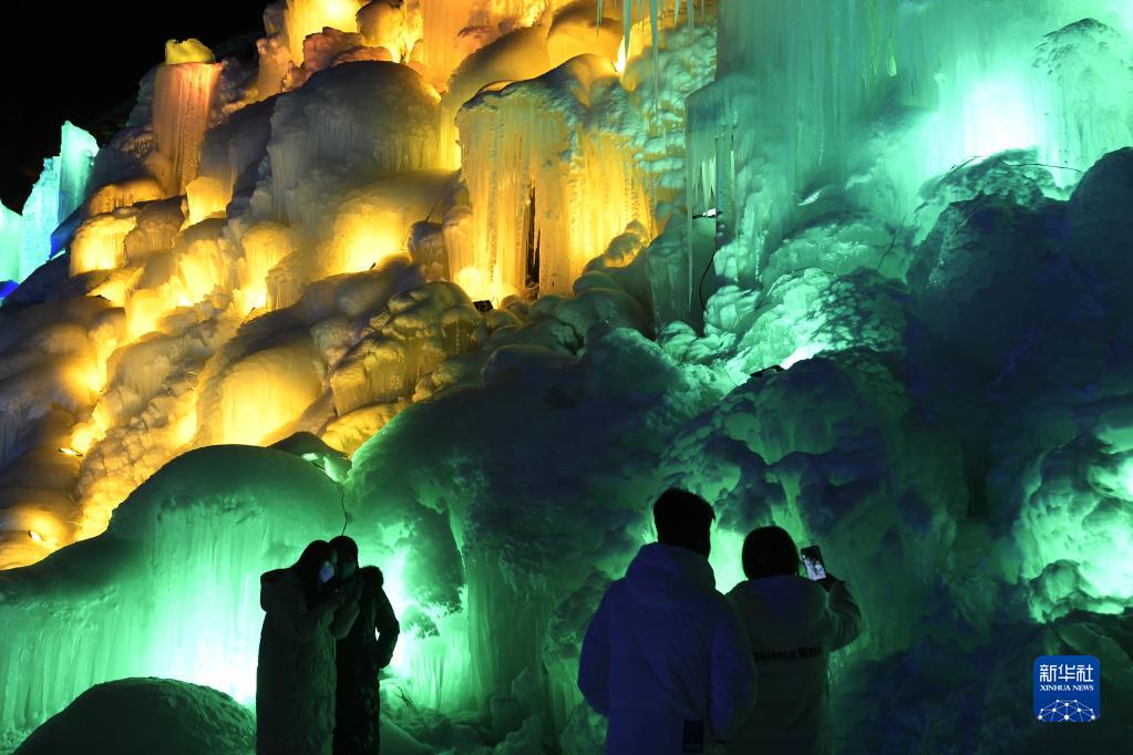 元旦將至,甘肅省積石山保安族東鄉族撒拉族自治縣大墩峽景區內的冰瀑、冰掛等景觀流光溢彩,夢幻的冰雪世界吸引了八方賓客前來賞景游玩。