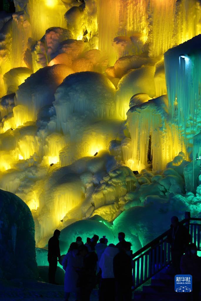 元旦將至,甘肅省積石山保安族東鄉族撒拉族自治縣大墩峽景區內的冰瀑、冰掛等景觀流光溢彩,夢幻的冰雪世界吸引了八方賓客前來賞景游玩。