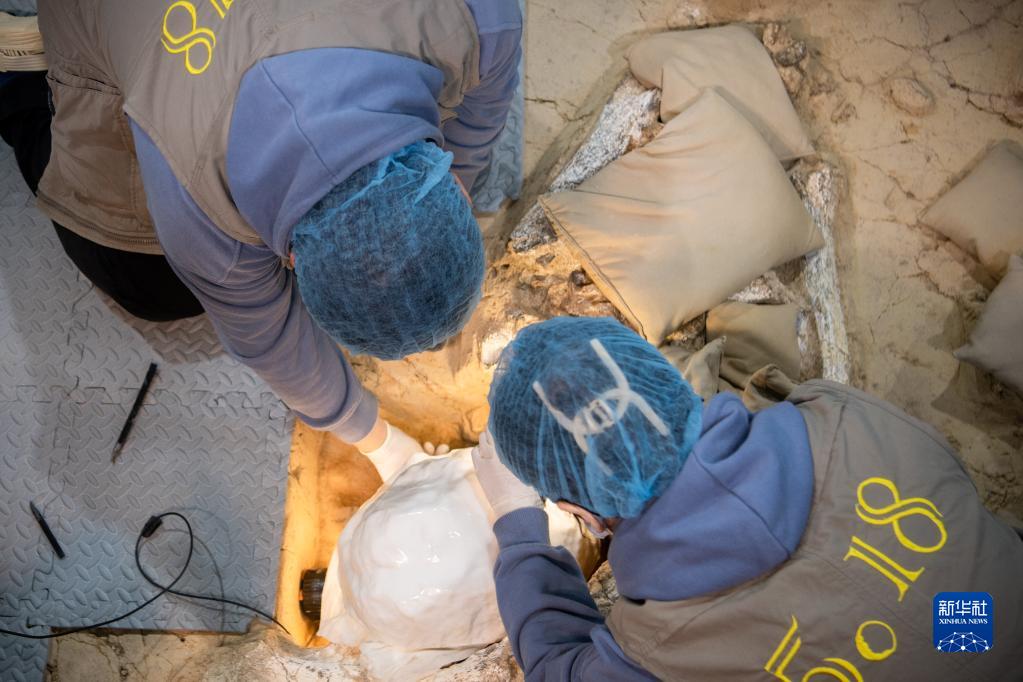 12月3日,考古隊員在提取頭骨化石。