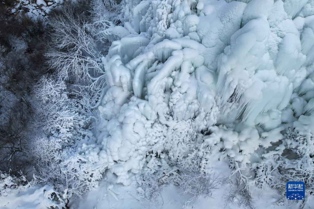 這是12月26日在甘肅省渭源縣天井峽(渭河東源)景區拍攝的冰瀑景觀(無人機照片)。
