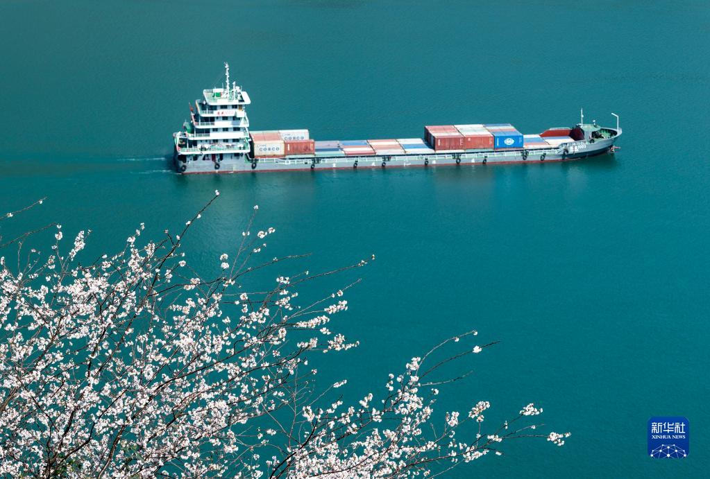 一艘貨船行駛在春花掩映下的長江三峽湖北省宜昌市秭歸縣水域(2022年3月8日攝)。