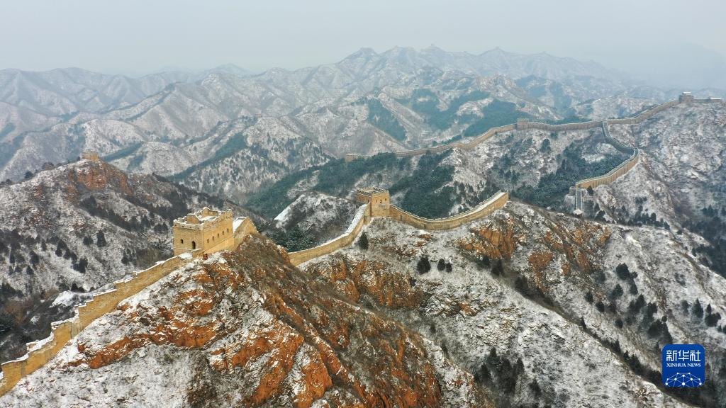 這是雪后的河北省承德市金山嶺長城(2022年1月22日攝,無人機照片)。