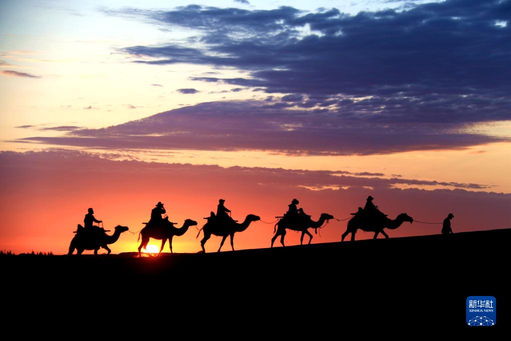 夏日晨曦下,游客在甘肅省敦煌市鳴沙山月牙泉景區游覽(2022年6月27日攝)。