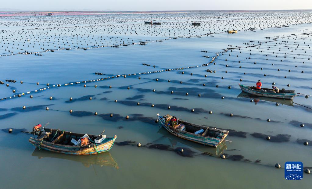 12月27日,在榮成市俚島灣海洋牧場海上養殖區,漁民駕駛漁船清理養殖筏架上的敷草(無人機照片)。
