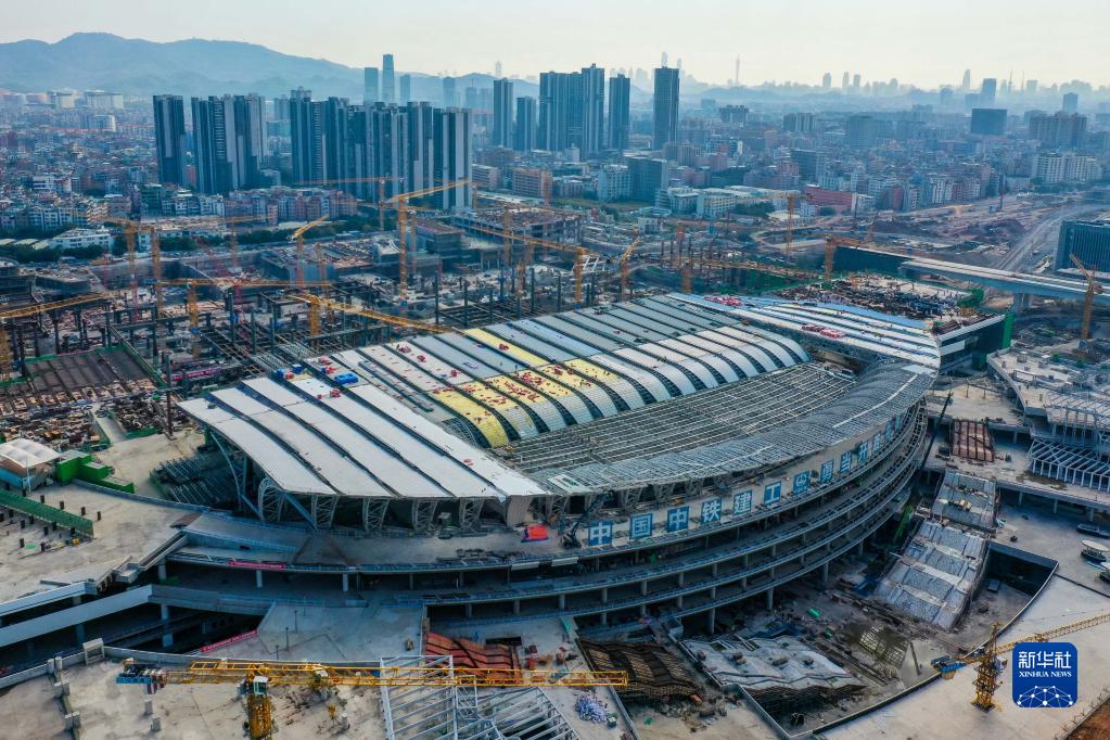 廣州白云火車站項目一期金屬屋面和二期主體結構建設現場(無人機照片,12月27日攝)。