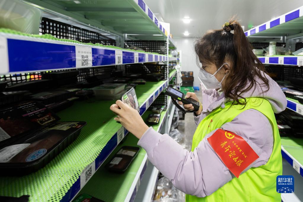 12月27日,在上海市徐匯區的美團買菜前置倉,青年突擊隊隊員掃碼商品條形碼,確定商品是否匹配。