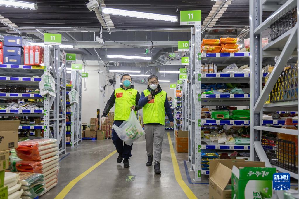 12月27日,在上海市徐匯區的美團買菜前置倉,青年突擊隊隊員進行分揀工作。