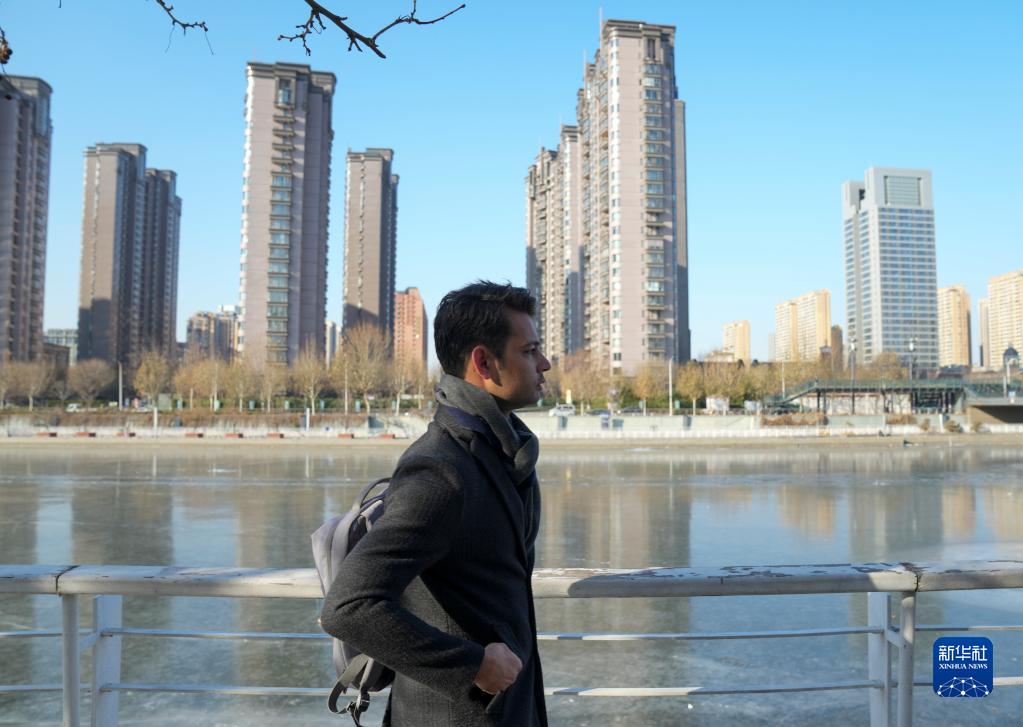 穆罕默德·納比爾走在天津海河邊(12月26日攝)。