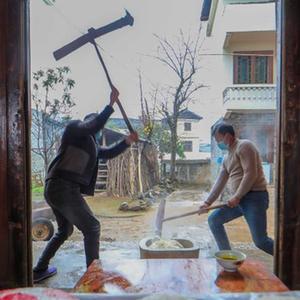 12月27日,岑鞏縣水尾鎮馬家寨村村民在打糍粑。