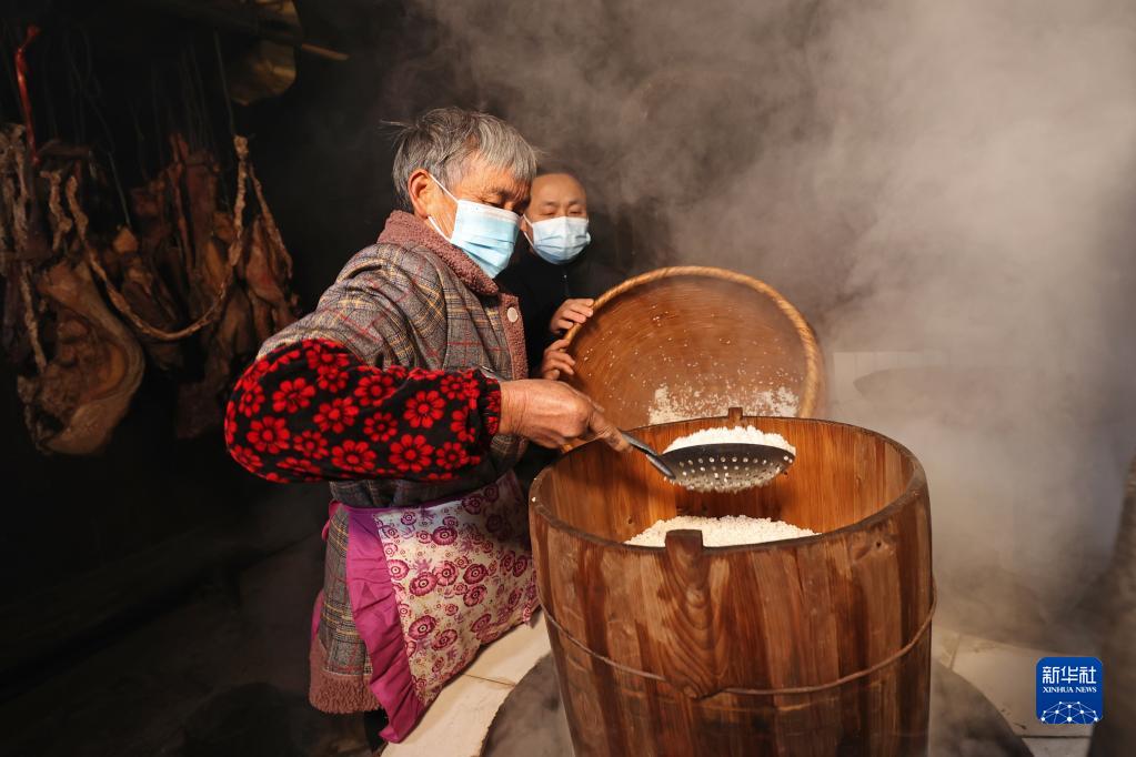 12月27日,岑鞏縣水尾鎮馬家寨村村民將泡好的糯米放入甑子蒸煮。