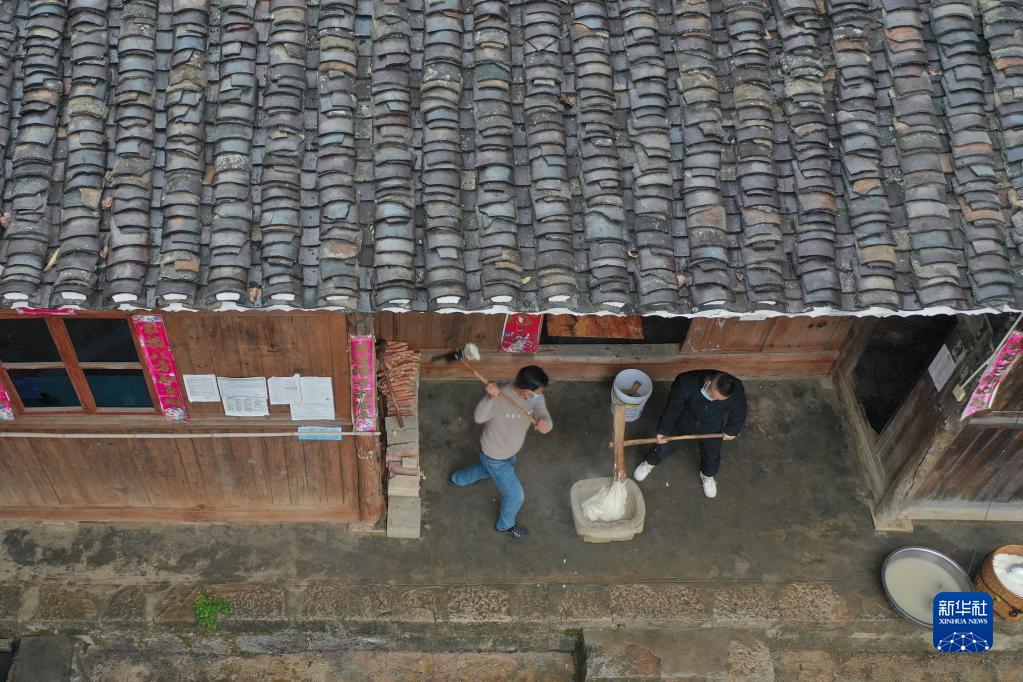 12月27日,岑鞏縣水尾鎮馬家寨村村民將糯米搗成糯米糍粑(無人機照片)。