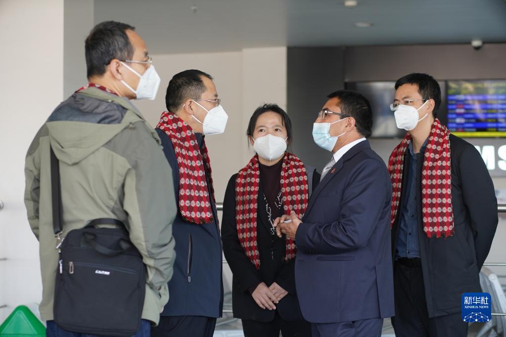 12月27日,尼泊爾鐵路局發言人阿曼·奇特洛卡(右二)在尼泊爾加德滿都機場迎接中國專家組。