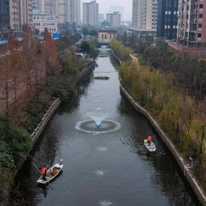 12月28日,龍泉街道的保潔人員在市陌河上清理漂浮物。