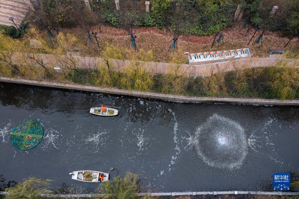12月28日,龍泉街道的保潔人員在市陌河上清理漂浮物(無人機照片)。