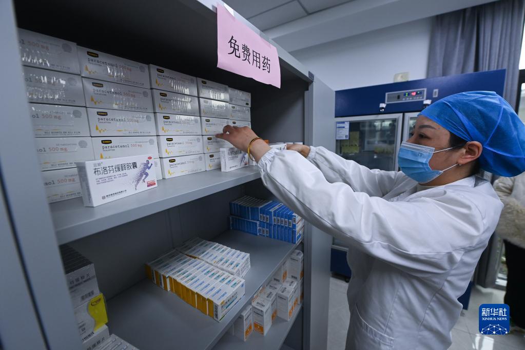 12月28日,在織里鎮軋村村衛生室的藥房內,醫生在整理一批用于免費贈藥給村民的解熱鎮痛藥物。