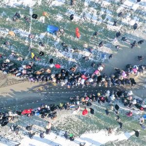 12月28日,游客在查干湖冰面上觀看冬捕(無人機照片)。